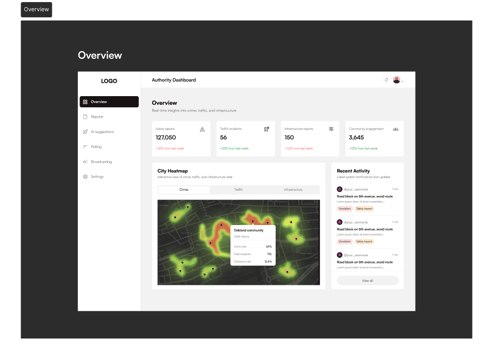 Overview Dashboard: Real-time insights with a city heatmap showing active and top reports at a glance.