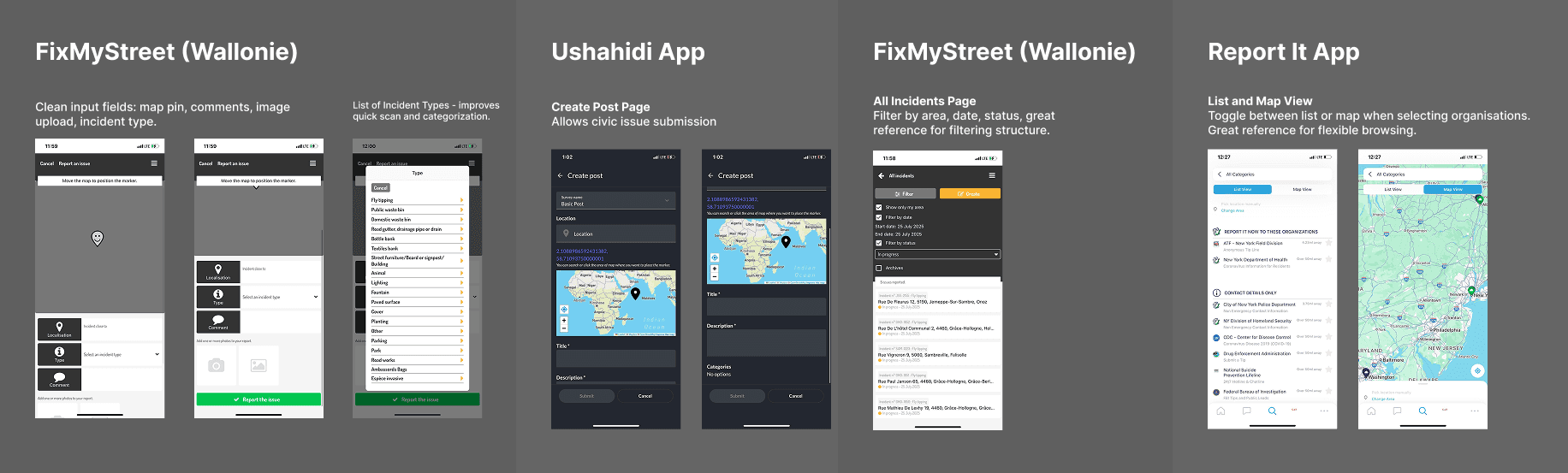 FixMyStreet & Ushahidi – their all-in-one reporting flows inspired CivicSight’s streamlined Report an Issue / Secret Mode design.