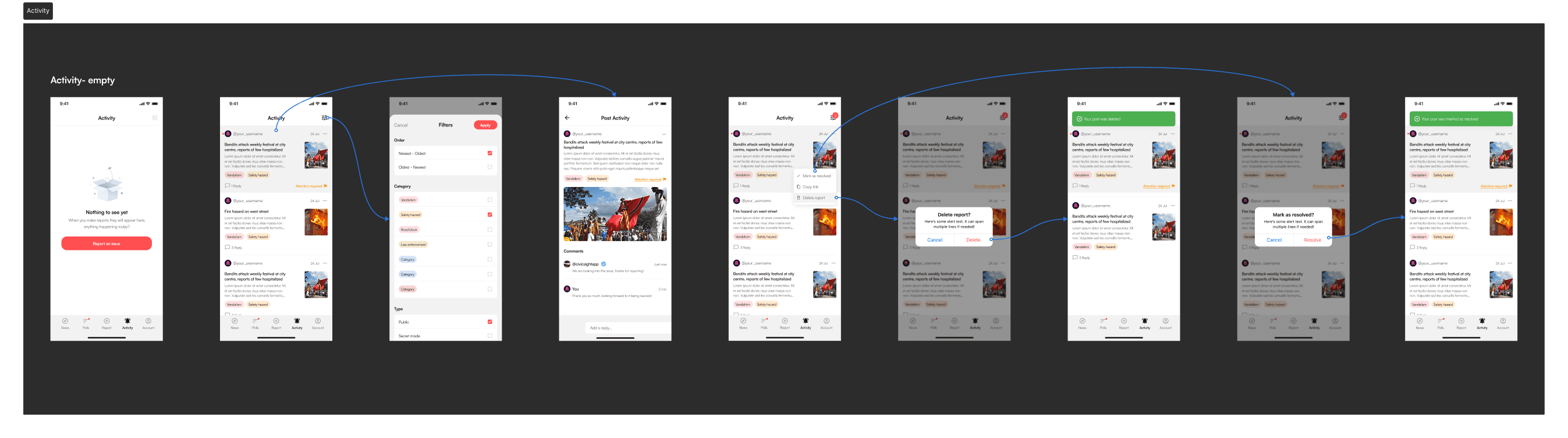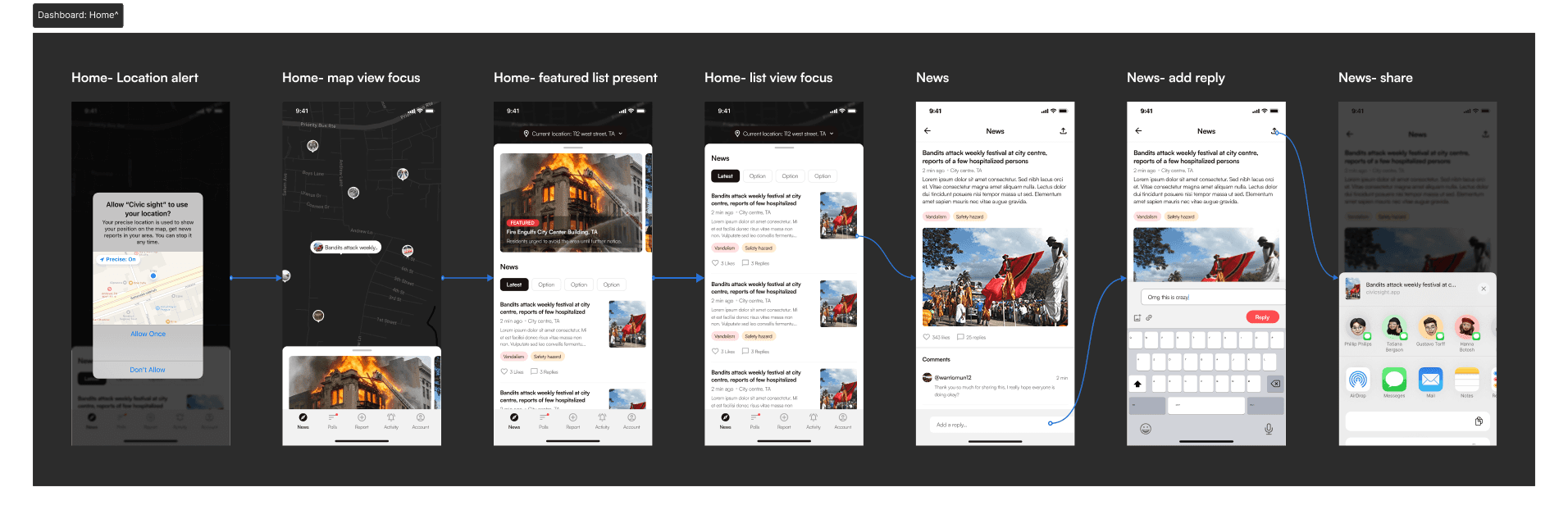 Homepage: Users can view community reports via list or map view, interact by commenting, sharing, or filtering posts.