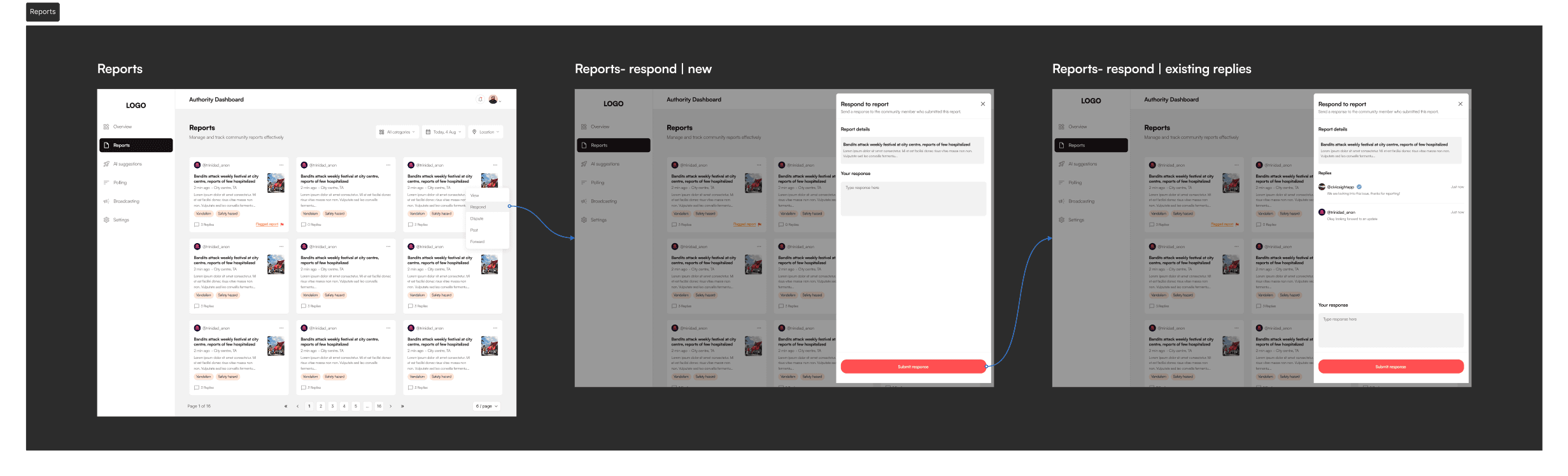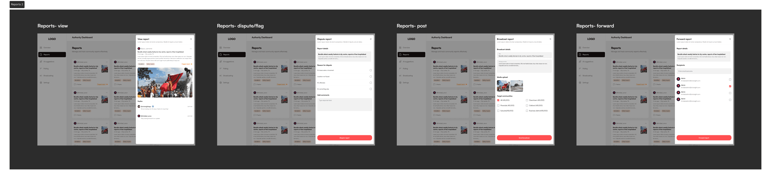 Reports Section: Authorities can manage and track reports - respond, broadcast updates, forward, or dispute them.