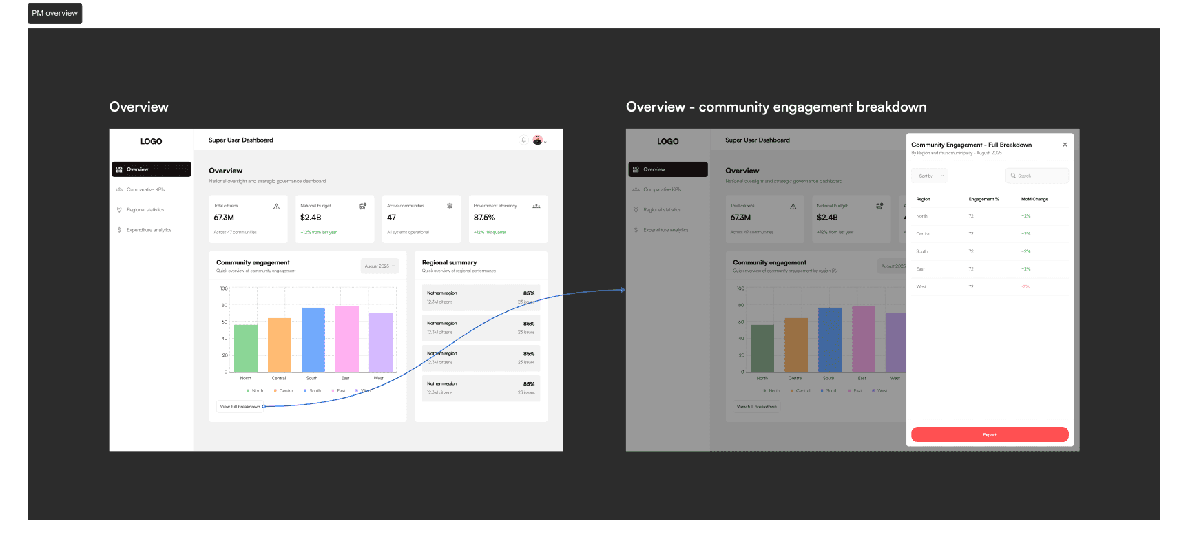 Overview Dashboard: National budget status, government efficiency metrics, and community engagement levels visualized with bar graphs for quick regional comparison.