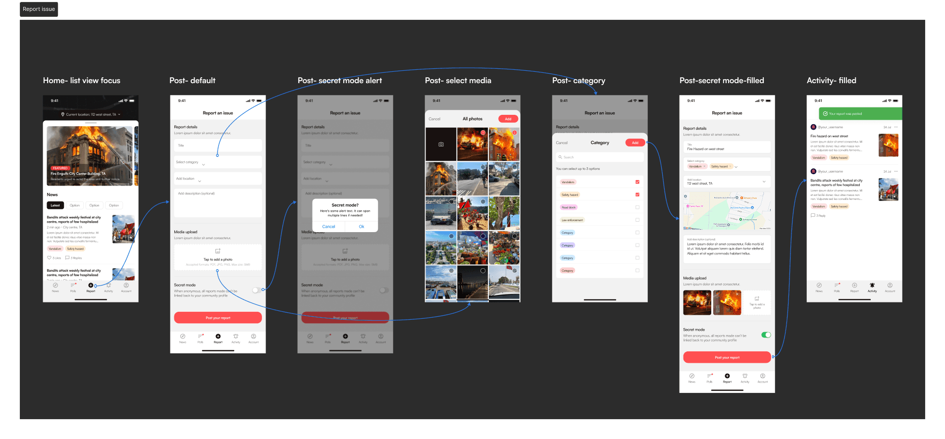 Report Issue Flow / Secret Mode: A single streamlined form where users input details, add a location, and upload media (photo + text). With the Secret Mode toggle, the report is sent anonymously.
