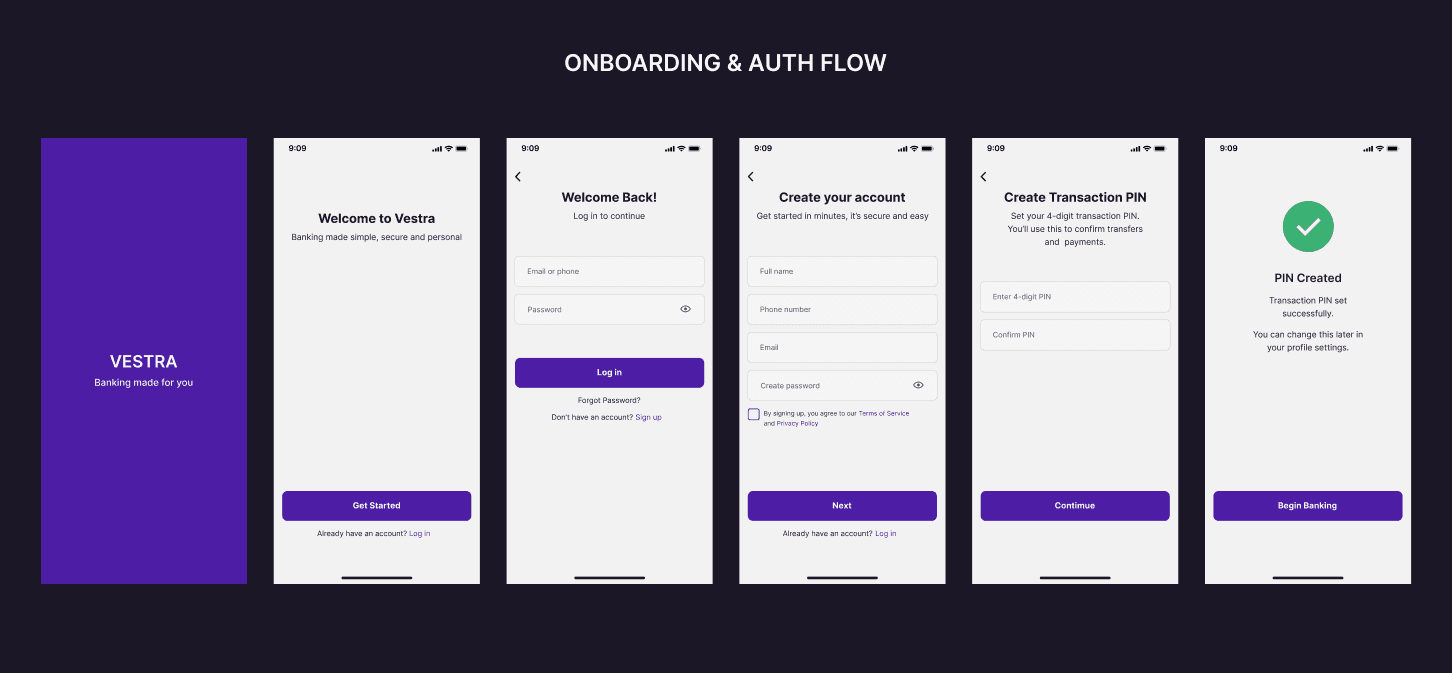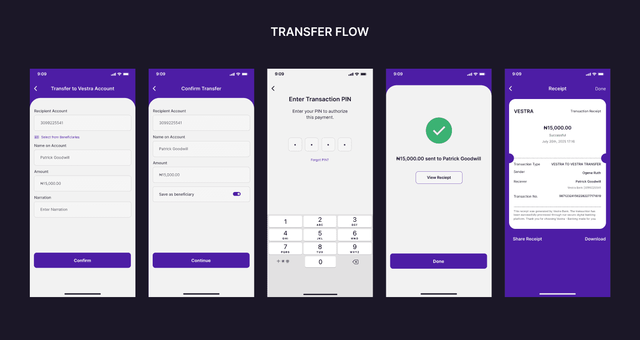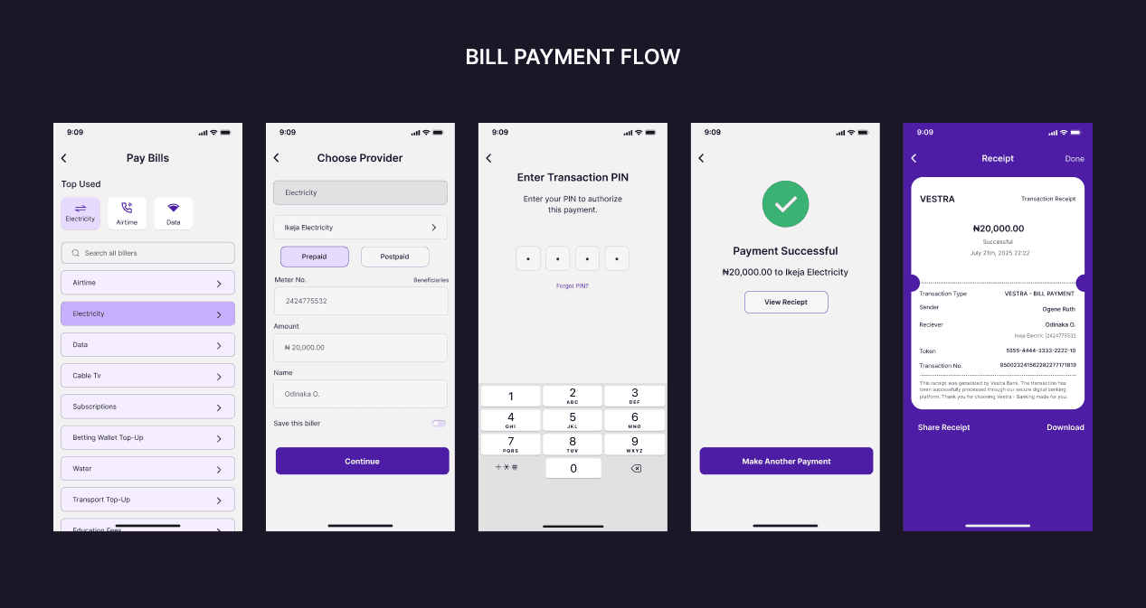 Vestra Bank is a mobile banking concept designed to simplify how Nigerians manage money on the go. The app prioritizes clarity, speed, and control, helping users perform everyday tasks like transfers, bill payments, and wallet top-ups effortlessly.