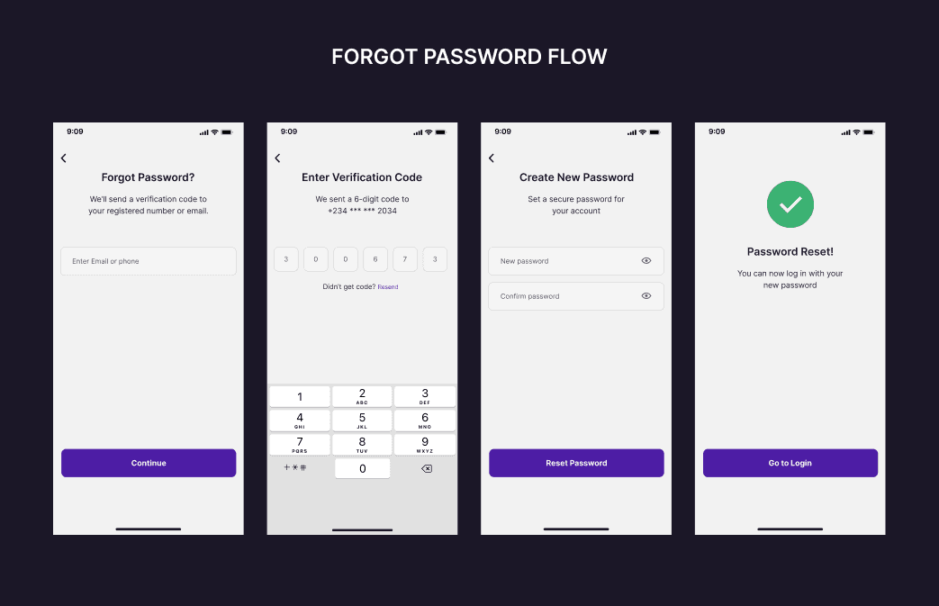 Smooth sign-up and login experience with clear entry points, short forms, and an intuitive layout. New users are prompted to create a transaction PIN to secure future payments.